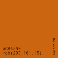 Цвет #CB650F в цветовой модели RGB обозначается тремя октетами (203, 101, 15) в десятичном формате и #CB650F в шестнадцатиричном (hex) формате, которые являются интенсивностью красного 203 (hex CB), интенсивность зелёного 101 (hex 65) и интенсивность синего 15 (hex 0F).