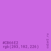 Цвет #CB66E2 в цветовой модели RGB обозначается тремя октетами (203, 102, 226) в десятичном формате и #CB66E2 в шестнадцатиричном (hex) формате, которые являются интенсивностью красного 203 (hex CB), интенсивность зелёного 102 (hex 66) и интенсивность синего 226 (hex E2).