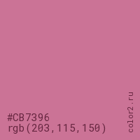 Цвет RGB(203, 115, 150) в процентом отношении количества цвета состоит из 79.6% красного (red), 45.1% зелёного (green) и 58.8% синего (blue).