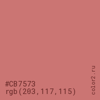 Цвет #CB7573 в цветовой модели RGB обозначается тремя октетами (203, 117, 115) в десятичном формате и #CB7573 в шестнадцатиричном (hex) формате, которые являются интенсивностью красного 203 (hex CB), интенсивность зелёного 117 (hex 75) и интенсивность синего 115 (hex 73).