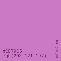 Цвет RGB(203, 121, 197) в процентом отношении количества цвета состоит из 79.6% красного (red), 47.5% зелёного (green) и 77.3% синего (blue).