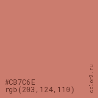 Цвет #CB7C6E в цветовой модели RGB обозначается тремя октетами (203, 124, 110) в десятичном формате и #CB7C6E в шестнадцатиричном (hex) формате, которые являются интенсивностью красного 203 (hex CB), интенсивность зелёного 124 (hex 7C) и интенсивность синего 110 (hex 6E).