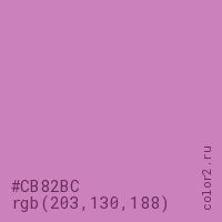 Цвет RGB(203, 130, 188) в процентом отношении количества цвета состоит из 79.6% красного (red), 51% зелёного (green) и 73.7% синего (blue).