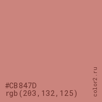 Цвет #CB847D в цветовой модели RGB обозначается тремя октетами (203, 132, 125) в десятичном формате и #CB847D в шестнадцатиричном (hex) формате, которые являются интенсивностью красного 203 (hex CB), интенсивность зелёного 132 (hex 84) и интенсивность синего 125 (hex 7D).