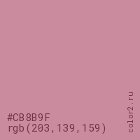 Цвет #CB8B9F в цветовой модели RGB обозначается тремя октетами (203, 139, 159) в десятичном формате и #CB8B9F в шестнадцатиричном (hex) формате, которые являются интенсивностью красного 203 (hex CB), интенсивность зелёного 139 (hex 8B) и интенсивность синего 159 (hex 9F).