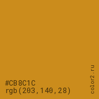 Цвет #CB8C1C в цветовой модели RGB обозначается тремя октетами (203, 140, 28) в десятичном формате и #CB8C1C в шестнадцатиричном (hex) формате, которые являются интенсивностью красного 203 (hex CB), интенсивность зелёного 140 (hex 8C) и интенсивность синего 28 (hex 1C).