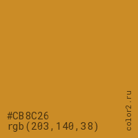 Цвет #CB8C26 в цветовой модели RGB обозначается тремя октетами (203, 140, 38) в десятичном формате и #CB8C26 в шестнадцатиричном (hex) формате, которые являются интенсивностью красного 203 (hex CB), интенсивность зелёного 140 (hex 8C) и интенсивность синего 38 (hex 26).