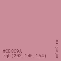 Цвет #CB8C9A в цветовой модели RGB обозначается тремя октетами (203, 140, 154) в десятичном формате и #CB8C9A в шестнадцатиричном (hex) формате, которые являются интенсивностью красного 203 (hex CB), интенсивность зелёного 140 (hex 8C) и интенсивность синего 154 (hex 9A).