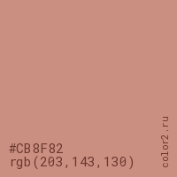 Цвет #CB8F82 в цветовой модели RGB обозначается тремя октетами (203, 143, 130) в десятичном формате и #CB8F82 в шестнадцатиричном (hex) формате, которые являются интенсивностью красного 203 (hex CB), интенсивность зелёного 143 (hex 8F) и интенсивность синего 130 (hex 82).
