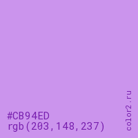 Цвет #CB94ED в цветовой модели RGB обозначается тремя октетами (203, 148, 237) в десятичном формате и #CB94ED в шестнадцатиричном (hex) формате, которые являются интенсивностью красного 203 (hex CB), интенсивность зелёного 148 (hex 94) и интенсивность синего 237 (hex ED).