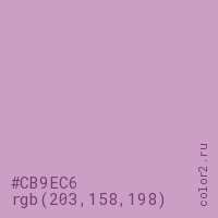 Цвет #CB9EC6 в цветовой модели RGB обозначается тремя октетами (203, 158, 198) в десятичном формате и #CB9EC6 в шестнадцатиричном (hex) формате, которые являются интенсивностью красного 203 (hex CB), интенсивность зелёного 158 (hex 9E) и интенсивность синего 198 (hex C6).