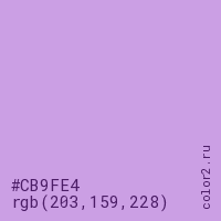 Цвет #CB9FE4 в цветовой модели RGB обозначается тремя октетами (203, 159, 228) в десятичном формате и #CB9FE4 в шестнадцатиричном (hex) формате, которые являются интенсивностью красного 203 (hex CB), интенсивность зелёного 159 (hex 9F) и интенсивность синего 228 (hex E4).