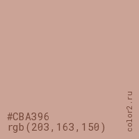 Цвет #CBA396 в цветовой модели RGB обозначается тремя октетами (203, 163, 150) в десятичном формате и #CBA396 в шестнадцатиричном (hex) формате, которые являются интенсивностью красного 203 (hex CB), интенсивность зелёного 163 (hex A3) и интенсивность синего 150 (hex 96).