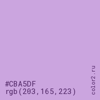 Цвет #CBA5DF в цветовой модели RGB обозначается тремя октетами (203, 165, 223) в десятичном формате и #CBA5DF в шестнадцатиричном (hex) формате, которые являются интенсивностью красного 203 (hex CB), интенсивность зелёного 165 (hex A5) и интенсивность синего 223 (hex DF).