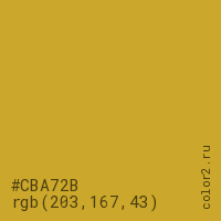 Цвет #CBA72B в цветовой модели RGB обозначается тремя октетами (203, 167, 43) в десятичном формате и #CBA72B в шестнадцатиричном (hex) формате, которые являются интенсивностью красного 203 (hex CB), интенсивность зелёного 167 (hex A7) и интенсивность синего 43 (hex 2B).