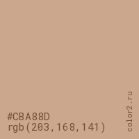 Цвет #CBA88D в цветовой модели RGB обозначается тремя октетами (203, 168, 141) в десятичном формате и #CBA88D в шестнадцатиричном (hex) формате, которые являются интенсивностью красного 203 (hex CB), интенсивность зелёного 168 (hex A8) и интенсивность синего 141 (hex 8D).