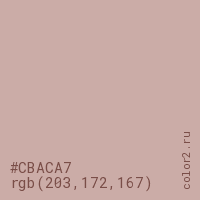 Цвет #CBACA7 в цветовой модели RGB обозначается тремя октетами (203, 172, 167) в десятичном формате и #CBACA7 в шестнадцатиричном (hex) формате, которые являются интенсивностью красного 203 (hex CB), интенсивность зелёного 172 (hex AC) и интенсивность синего 167 (hex A7).