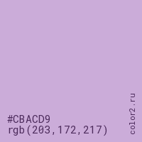 Цвет #CBACD9 в цветовой модели RGB обозначается тремя октетами (203, 172, 217) в десятичном формате и #CBACD9 в шестнадцатиричном (hex) формате, которые являются интенсивностью красного 203 (hex CB), интенсивность зелёного 172 (hex AC) и интенсивность синего 217 (hex D9).