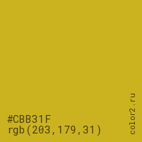 Цвет #CBB31F в цветовой модели RGB обозначается тремя октетами (203, 179, 31) в десятичном формате и #CBB31F в шестнадцатиричном (hex) формате, которые являются интенсивностью красного 203 (hex CB), интенсивность зелёного 179 (hex B3) и интенсивность синего 31 (hex 1F).