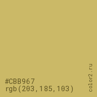 Цвет #CBB967 в цветовой модели RGB обозначается тремя октетами (203, 185, 103) в десятичном формате и #CBB967 в шестнадцатиричном (hex) формате, которые являются интенсивностью красного 203 (hex CB), интенсивность зелёного 185 (hex B9) и интенсивность синего 103 (hex 67).