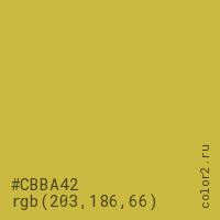 Цвет #CBBA42 в цветовой модели RGB обозначается тремя октетами (203, 186, 66) в десятичном формате и #CBBA42 в шестнадцатиричном (hex) формате, которые являются интенсивностью красного 203 (hex CB), интенсивность зелёного 186 (hex BA) и интенсивность синего 66 (hex 42).