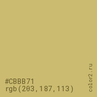Цвет #CBBB71 в цветовой модели RGB обозначается тремя октетами (203, 187, 113) в десятичном формате и #CBBB71 в шестнадцатиричном (hex) формате, которые являются интенсивностью красного 203 (hex CB), интенсивность зелёного 187 (hex BB) и интенсивность синего 113 (hex 71).