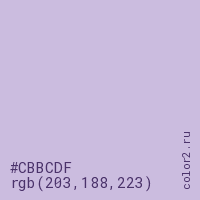 Цвет #CBBCDF в цветовой модели RGB обозначается тремя октетами (203, 188, 223) в десятичном формате и #CBBCDF в шестнадцатиричном (hex) формате, которые являются интенсивностью красного 203 (hex CB), интенсивность зелёного 188 (hex BC) и интенсивность синего 223 (hex DF).