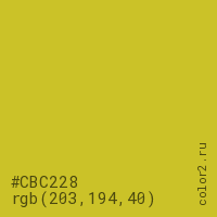 Цвет #CBC228 в цветовой модели RGB обозначается тремя октетами (203, 194, 40) в десятичном формате и #CBC228 в шестнадцатиричном (hex) формате, которые являются интенсивностью красного 203 (hex CB), интенсивность зелёного 194 (hex C2) и интенсивность синего 40 (hex 28).