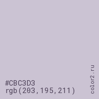 Цвет #CBC3D3 в цветовой модели RGB обозначается тремя октетами (203, 195, 211) в десятичном формате и #CBC3D3 в шестнадцатиричном (hex) формате, которые являются интенсивностью красного 203 (hex CB), интенсивность зелёного 195 (hex C3) и интенсивность синего 211 (hex D3).