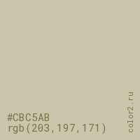 Цвет #CBC5AB в цветовой модели RGB обозначается тремя октетами (203, 197, 171) в десятичном формате и #CBC5AB в шестнадцатиричном (hex) формате, которые являются интенсивностью красного 203 (hex CB), интенсивность зелёного 197 (hex C5) и интенсивность синего 171 (hex AB).