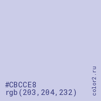 Цвет #CBCCE8 в цветовой модели RGB обозначается тремя октетами (203, 204, 232) в десятичном формате и #CBCCE8 в шестнадцатиричном (hex) формате, которые являются интенсивностью красного 203 (hex CB), интенсивность зелёного 204 (hex CC) и интенсивность синего 232 (hex E8).