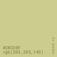 Цвет #CBCD8F в цветовой модели RGB обозначается тремя октетами (203, 205, 143) в десятичном формате и #CBCD8F в шестнадцатиричном (hex) формате, которые являются интенсивностью красного 203 (hex CB), интенсивность зелёного 205 (hex CD) и интенсивность синего 143 (hex 8F).