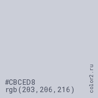 Цвет #CBCED8 в цветовой модели RGB обозначается тремя октетами (203, 206, 216) в десятичном формате и #CBCED8 в шестнадцатиричном (hex) формате, которые являются интенсивностью красного 203 (hex CB), интенсивность зелёного 206 (hex CE) и интенсивность синего 216 (hex D8).