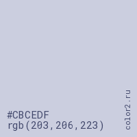 Цвет #CBCEDF в цветовой модели RGB обозначается тремя октетами (203, 206, 223) в десятичном формате и #CBCEDF в шестнадцатиричном (hex) формате, которые являются интенсивностью красного 203 (hex CB), интенсивность зелёного 206 (hex CE) и интенсивность синего 223 (hex DF).