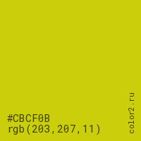 Цвет #CBCF0B в цветовой модели RGB обозначается тремя октетами (203, 207, 11) в десятичном формате и #CBCF0B в шестнадцатиричном (hex) формате, которые являются интенсивностью красного 203 (hex CB), интенсивность зелёного 207 (hex CF) и интенсивность синего 11 (hex 0B).