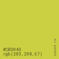 Цвет #CBD043 в цветовой модели RGB обозначается тремя октетами (203, 208, 67) в десятичном формате и #CBD043 в шестнадцатиричном (hex) формате, которые являются интенсивностью красного 203 (hex CB), интенсивность зелёного 208 (hex D0) и интенсивность синего 67 (hex 43).