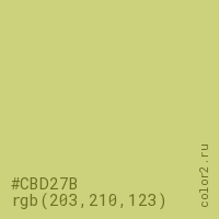 Цвет #CBD27B в цветовой модели RGB обозначается тремя октетами (203, 210, 123) в десятичном формате и #CBD27B в шестнадцатиричном (hex) формате, которые являются интенсивностью красного 203 (hex CB), интенсивность зелёного 210 (hex D2) и интенсивность синего 123 (hex 7B).