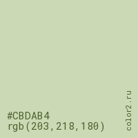 Цвет #CBDAB4 в цветовой модели RGB обозначается тремя октетами (203, 218, 180) в десятичном формате и #CBDAB4 в шестнадцатиричном (hex) формате, которые являются интенсивностью красного 203 (hex CB), интенсивность зелёного 218 (hex DA) и интенсивность синего 180 (hex B4).