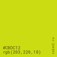 Цвет #CBDC12 в цветовой модели RGB обозначается тремя октетами (203, 220, 18) в десятичном формате и #CBDC12 в шестнадцатиричном (hex) формате, которые являются интенсивностью красного 203 (hex CB), интенсивность зелёного 220 (hex DC) и интенсивность синего 18 (hex 12).