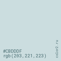 Цвет #CBDDDF в цветовой модели RGB обозначается тремя октетами (203, 221, 223) в десятичном формате и #CBDDDF в шестнадцатиричном (hex) формате, которые являются интенсивностью красного 203 (hex CB), интенсивность зелёного 221 (hex DD) и интенсивность синего 223 (hex DF).
