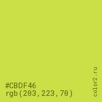 Цвет #CBDF46 в цветовой модели RGB обозначается тремя октетами (203, 223, 70) в десятичном формате и #CBDF46 в шестнадцатиричном (hex) формате, которые являются интенсивностью красного 203 (hex CB), интенсивность зелёного 223 (hex DF) и интенсивность синего 70 (hex 46).