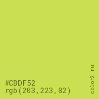 Цвет #CBDF52 в цветовой модели RGB обозначается тремя октетами (203, 223, 82) в десятичном формате и #CBDF52 в шестнадцатиричном (hex) формате, которые являются интенсивностью красного 203 (hex CB), интенсивность зелёного 223 (hex DF) и интенсивность синего 82 (hex 52).