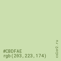 Цвет #CBDFAE в цветовой модели RGB обозначается тремя октетами (203, 223, 174) в десятичном формате и #CBDFAE в шестнадцатиричном (hex) формате, которые являются интенсивностью красного 203 (hex CB), интенсивность зелёного 223 (hex DF) и интенсивность синего 174 (hex AE).