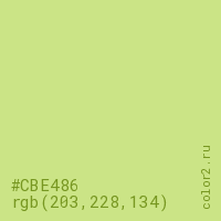 Цвет #CBE486 в цветовой модели RGB обозначается тремя октетами (203, 228, 134) в десятичном формате и #CBE486 в шестнадцатиричном (hex) формате, которые являются интенсивностью красного 203 (hex CB), интенсивность зелёного 228 (hex E4) и интенсивность синего 134 (hex 86).