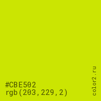 Цвет #CBE502 в цветовой модели RGB обозначается тремя октетами (203, 229, 2) в десятичном формате и #CBE502 в шестнадцатиричном (hex) формате, которые являются интенсивностью красного 203 (hex CB), интенсивность зелёного 229 (hex E5) и интенсивность синего 2 (hex 02).