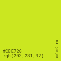 Цвет #CBE720 в цветовой модели RGB обозначается тремя октетами (203, 231, 32) в десятичном формате и #CBE720 в шестнадцатиричном (hex) формате, которые являются интенсивностью красного 203 (hex CB), интенсивность зелёного 231 (hex E7) и интенсивность синего 32 (hex 20).