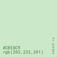 Цвет #CBE8C9 в цветовой модели RGB обозначается тремя октетами (203, 232, 201) в десятичном формате и #CBE8C9 в шестнадцатиричном (hex) формате, которые являются интенсивностью красного 203 (hex CB), интенсивность зелёного 232 (hex E8) и интенсивность синего 201 (hex C9).