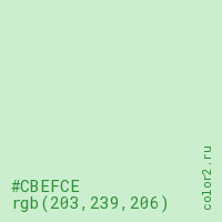 Цвет #CBEFCE в цветовой модели RGB обозначается тремя октетами (203, 239, 206) в десятичном формате и #CBEFCE в шестнадцатиричном (hex) формате, которые являются интенсивностью красного 203 (hex CB), интенсивность зелёного 239 (hex EF) и интенсивность синего 206 (hex CE).