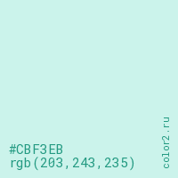Цвет RGB(203, 243, 235) в процентом отношении количества цвета состоит из 79.6% красного (red), 95.3% зелёного (green) и 92.2% синего (blue).