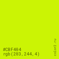 Цвет #CBF404 в цветовой модели RGB обозначается тремя октетами (203, 244, 4) в десятичном формате и #CBF404 в шестнадцатиричном (hex) формате, которые являются интенсивностью красного 203 (hex CB), интенсивность зелёного 244 (hex F4) и интенсивность синего 4 (hex 04).